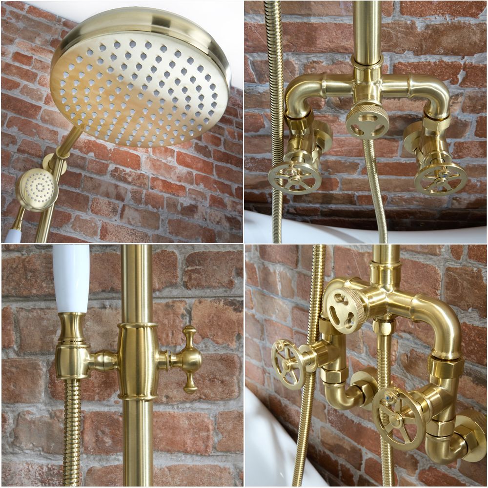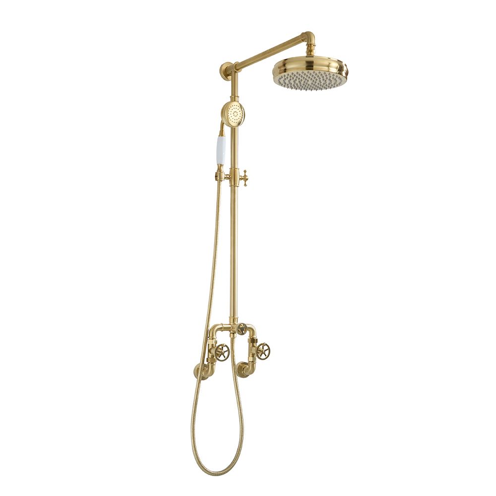 Apportez une touche industrielle à votre salle de bain avec la colonne de douche or satiné au design steampunk Zandra comprenant mitigeur, pommeau de douche rond et douchette.
