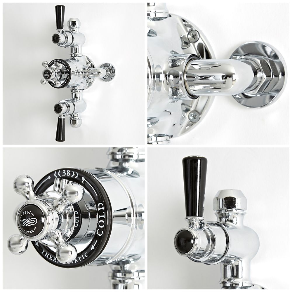 Rénovez votre salle de bain et créez un look rétro et élégant avec le kit de la colonne de douche Elizabeth, composé d’un mitigeur de douche thermostatique exposé, d’un pommeau de douche, d’une douchette et d’un bec verseur baignoire.