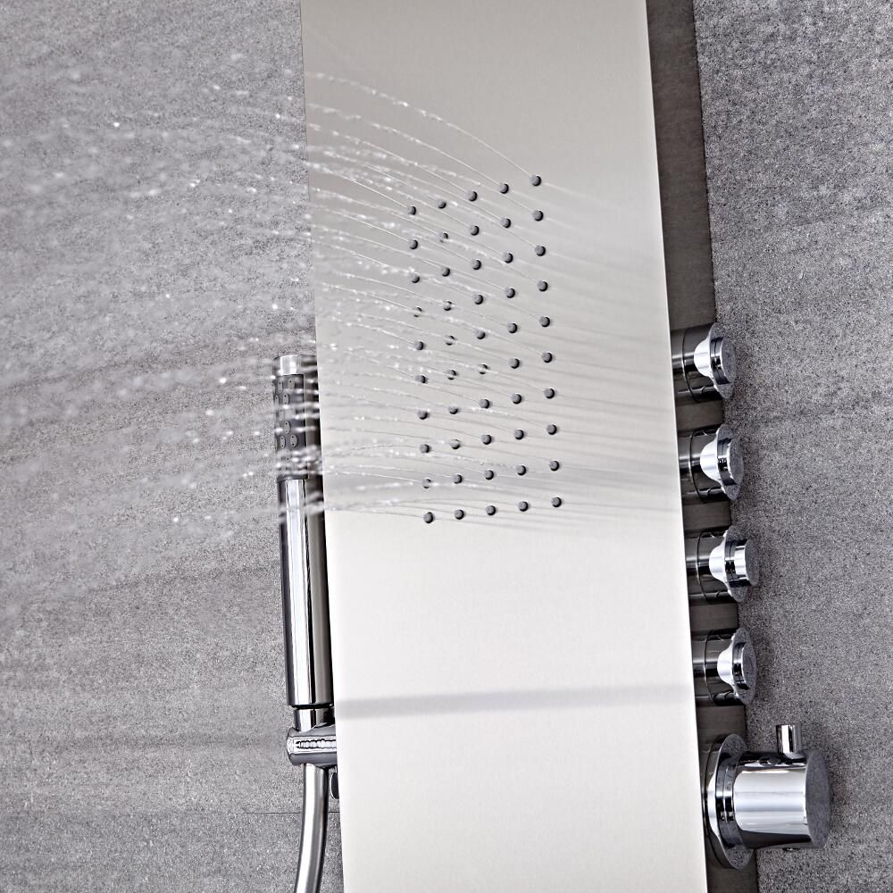 Colonne de douche thermostatique exposée avec étagère, grand pommeau cascade, douchette et buse hydromassante – Chromé – Vista