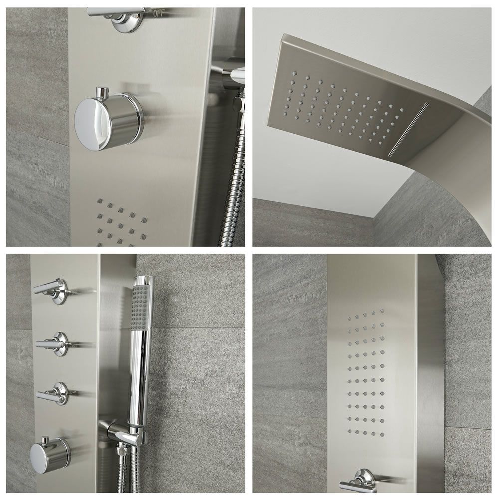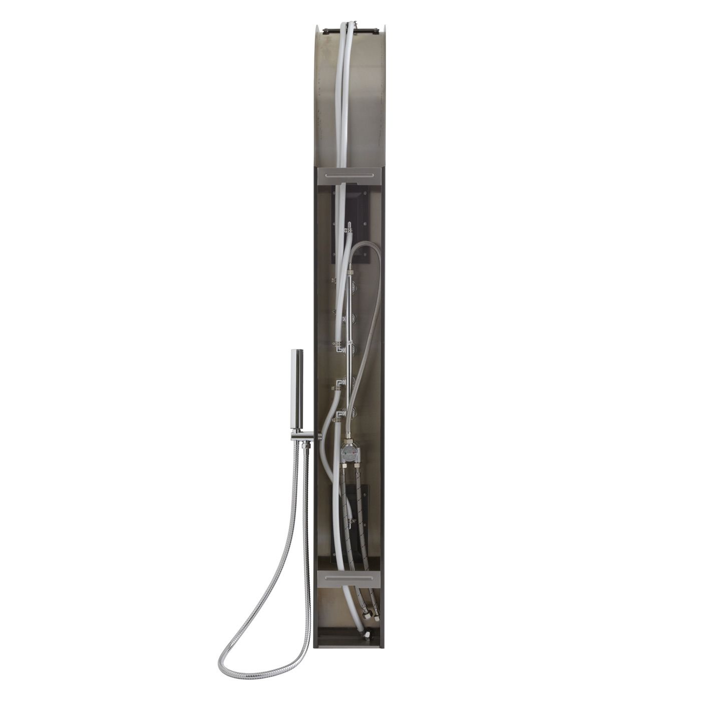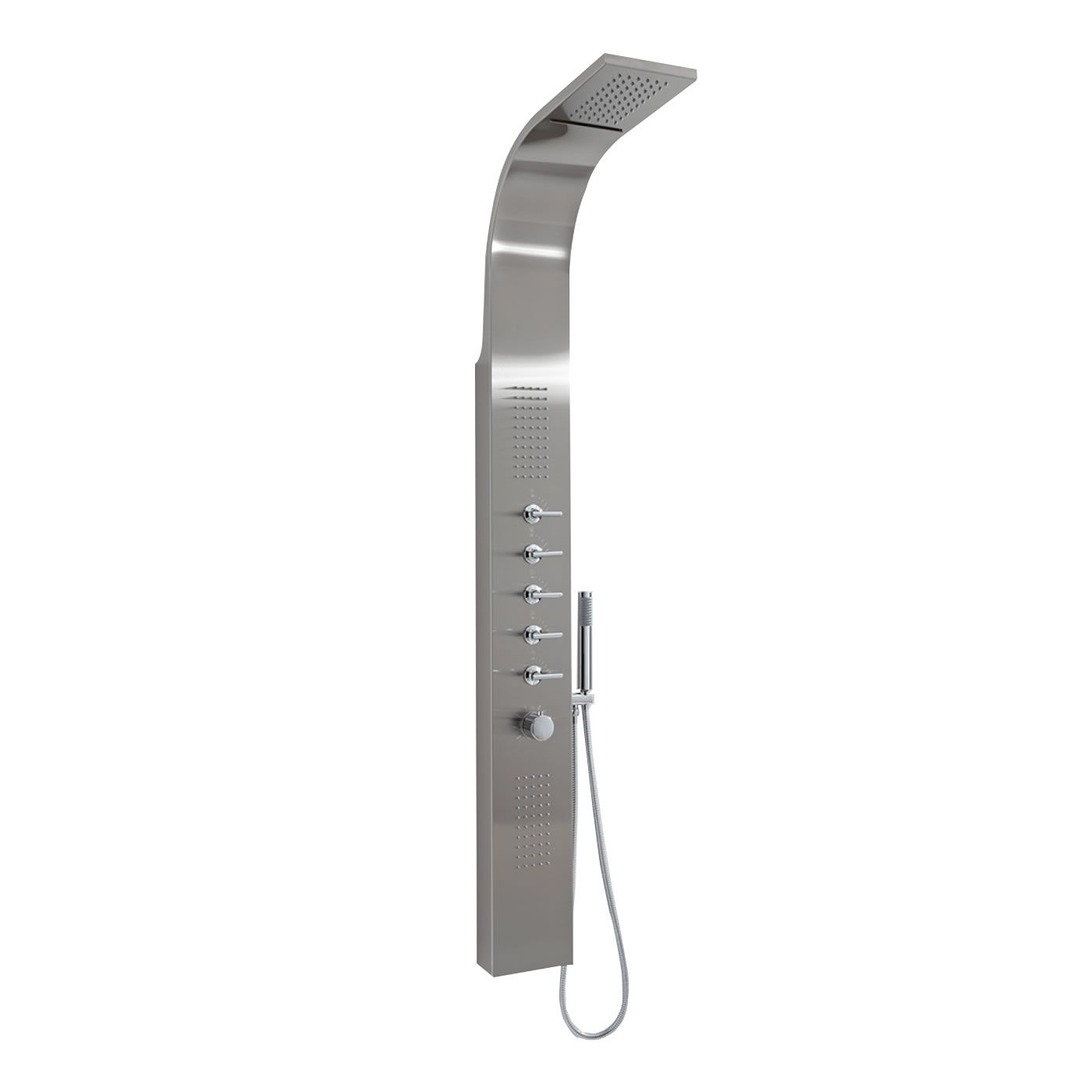 Fabriquée en acier inoxydable de première qualité, cette colonne de douche est équipée d'un grand pommeau de douche à effet pluie, d'un jet cascade, de deux buses de massage et d'une douchette avec flexible.