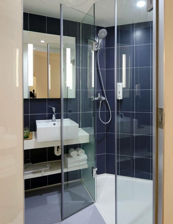 Pour une sensation spacieuse dans une petite salle d’eau, privilégiez les matériaux qui réfléchissent et reflètent la lumière, comme le chrome ou le verre par exemple.
