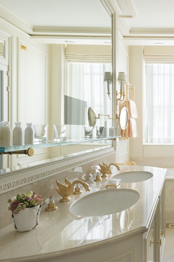 Pour une salle de bain raffinée au style luxueux sans être trop opulent, optez pour des robinets à la finition or brossé. Ils ajouteront par la même occasion, une touche vintage très élégante, à votre salle de bain.