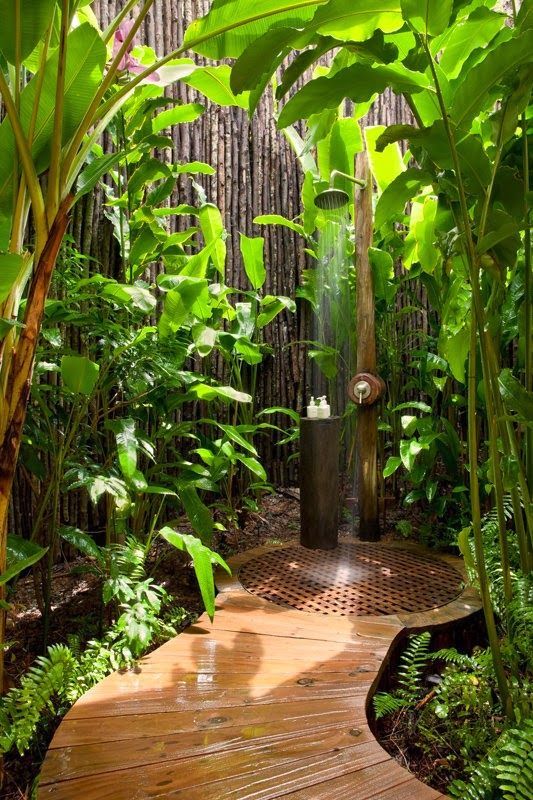 On rêve tous de vivre dans un pays suffisamment chaud pour bénéficier d’une salle de bain à l’extérieur toute l’année. Comme cette douche extérieure, installée au milieu d’une végétation magnifique, au bout de cette allée en bois qui nous fait rêver. Comme un parfum de vacances…