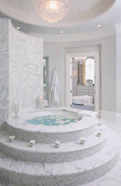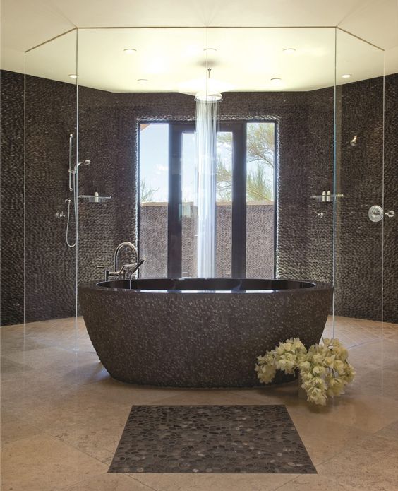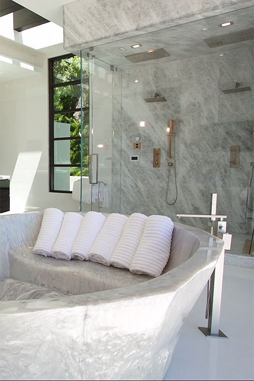 Quoi de plus luxueux que le marbre dans une salle de bain ? Cette pierre, symbole de luxe, qui nous rappelle les décors somptueux de l’antiquité gréco-romaine se suffit à elle-même. Alors quand lemarbre est, en plus, associé à une baignoire à couper le souffle… On vous laisse en juger par vous-même.