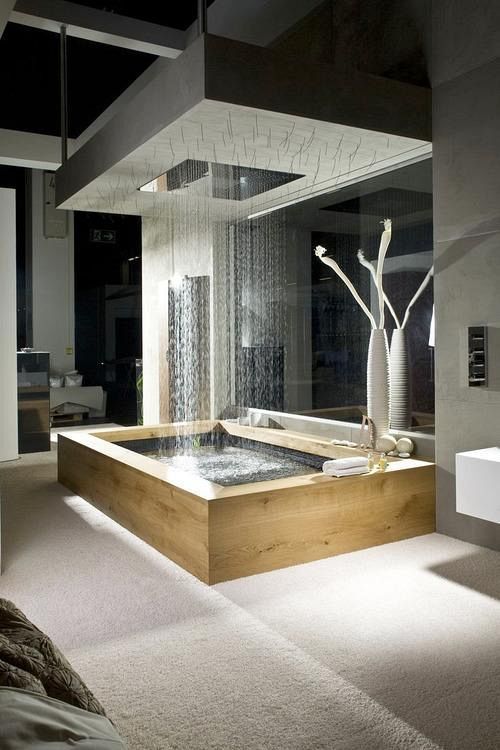 Nous nous sommes tous déjà posé la même question en voyant une magnifique baignoire trônant fièrement devant une immense baie vitrée donnant sur un paysage urbain : est-ce trop exposé ? Celle-ci est en revanche tellement élevée qu’elle laisse voir un panorama à couper le souffle des toits et lumières de la ville, qui doit donner un grand sentiment de sérénité, et l’impression de se baigner dans le ciel.