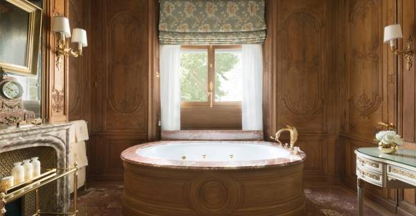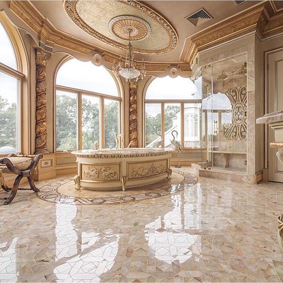 Et finalement, de la pierre, des dorures et des colonnes : bienvenue dans la salle de bain de château ! Ces dernières sont souvent le théâtre de mélanges intéressants entre le confort ultramoderne et le style de la noblesse d’autres siècles (lui-même inspiré par les ornements et symboles gréco-romains), comme vous pouvez le constater ci-dessous. Ces baignoires n’ont, bien entendu, jamais appartenu à Louis XIV.