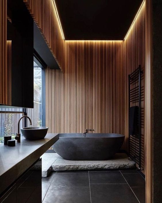 Une lumière froide, comme nous pouvons le voir sur la première photo, créera une atmosphère très moderne, voire futuriste , alors qu’une teinte de blanc chaud offrira une ambiance intime et secrète. Le même effet est produit par l’ajout d’accessoires chromés ou argentés pour un ton froid, ou d’accessoires dorés pour un ton chaud. Dans les deux cas, la salle de bain noire semble bel et bien exister hors du temps.