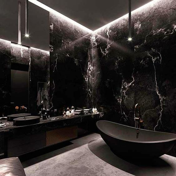 La lumière est un point primordial dans la salle de bain noire. Dans les salles de bain totalement noires en l’absence de fenêtre où l’éclairage est uniquement artificiel, la teinte de lumière changera totalement l’ambiance de la pièce.
