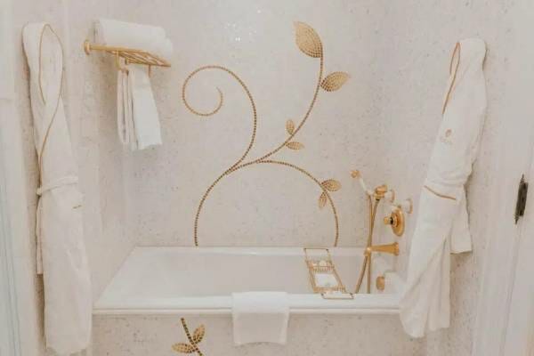 Nous avons souhaité commencer doucement. Oui, doucement est une façon de parler car, bien que la baignoire en elle-même soit relativement sobre, la sublime mosaïque qui la parcourt est faite d’or. Il en va de même pour la robinetterie, et vous pourrez ainsi trouver dans cet hôtel, un magnifique lavabo recouvert d’or 24 carats.