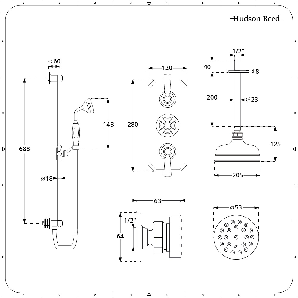 Apportez un style rétro et élégant à votre salle de bain avec le kit de douche Elizabeth qui comprend un mitigeur de douche thermostatique à triple fonctions avec inverseur, un pommeau plafonnier d’un diamètre de 20 cm, un kit douchette sur rampe et des buses hydromassantes.