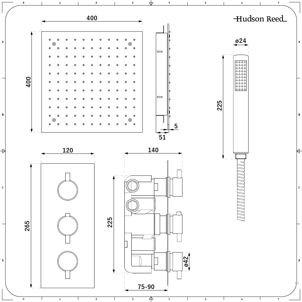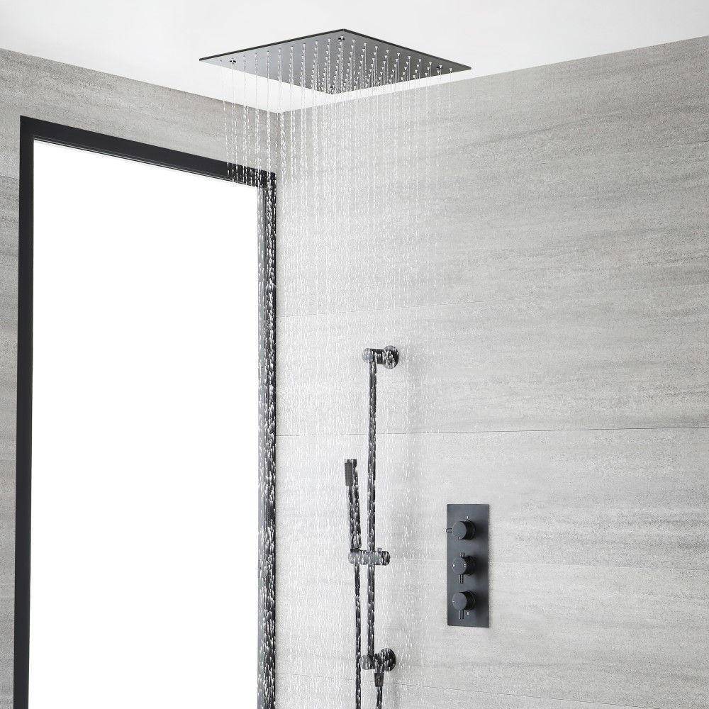 Doté d’une finition noir mat, ce kit de douche est composé d’un mitigeur thermostatique à double fonctions, d’un pommeau à encastrer au plafond et d’un kit douchette sur rampe avec douchette et flexible.