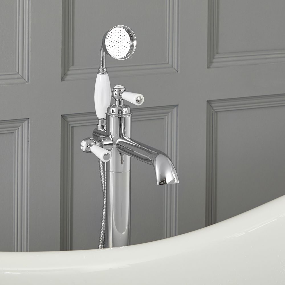 Idéal pour une utilisation avec l'une de nos baignoires en îlot, ce robinet bain douche est doté d'une finition chromée et blanche. Fabriqué en laiton massif durable, il est muni de commandes à levier pour un contrôle facile du débit et de la température de l’eau.