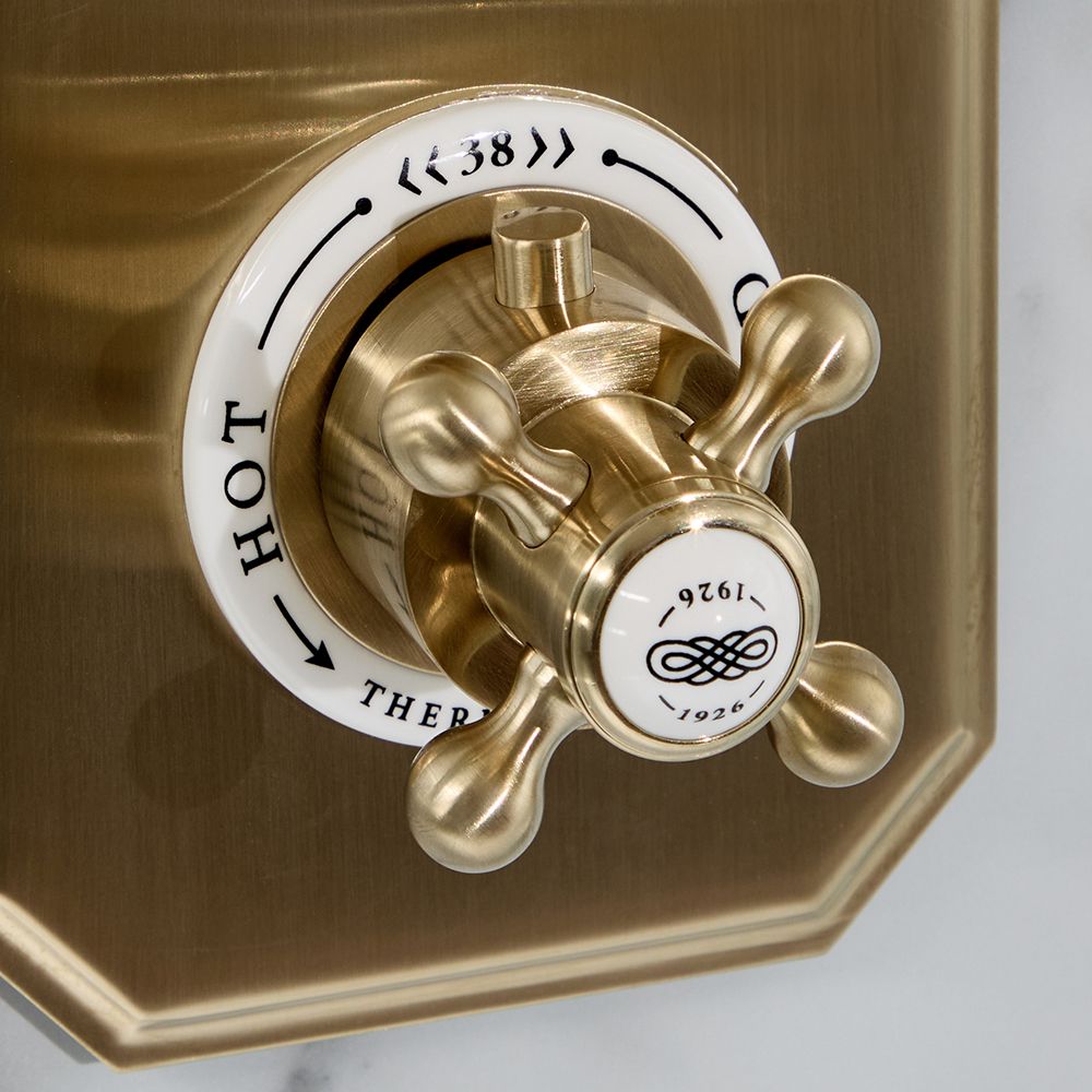 Conçu pour fournir facilement de l’eau vers deux fonctions telle qu’une douchette et un pommeau de douche, ce mitigeur dispose d’une technologie anti-brûlures pour une expérience de couche sécurisée et confortable. Fabriqué en laiton massif durable, il dispose d’une finition or satiné et de détails en céramique blanche.