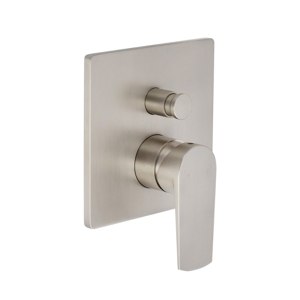Conçu en laiton, le mitigeur présente une finition nickel brossé et permet l'usage de deux fonctions, comme une pomme de douche et une douchette, ou un bec verseur pour créer un bain douche. Il est aussi en harmonie avec un espace douche minimaliste contemporain.
