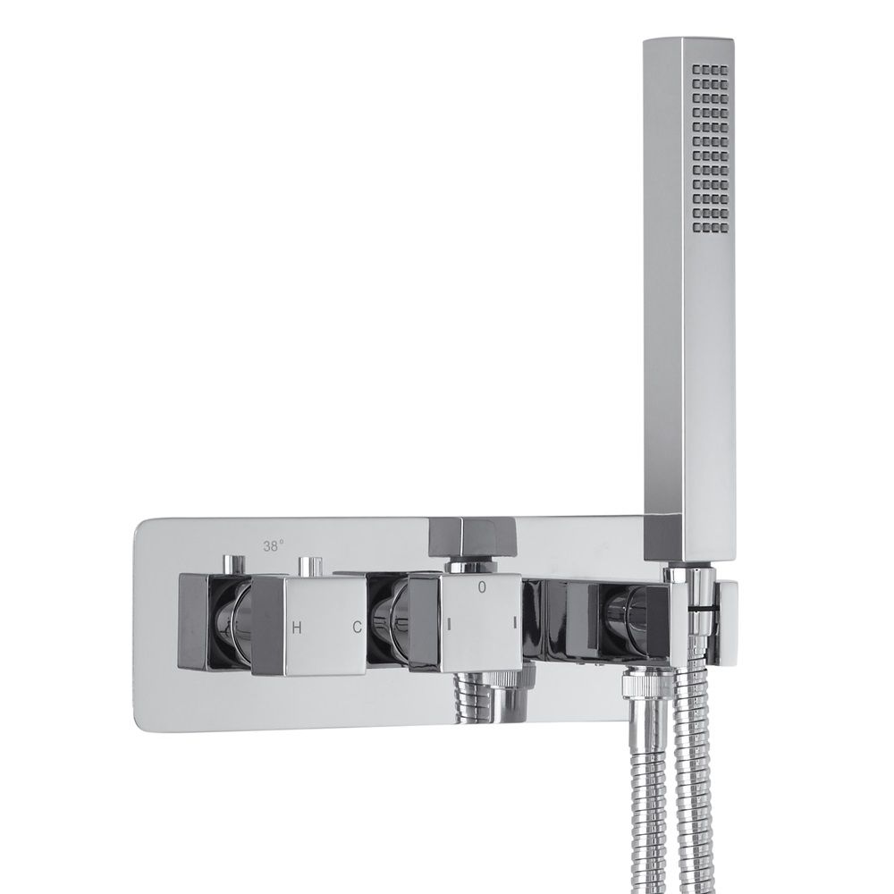 Apportez une touche design à votre salle de bain avec le mitigeur de douche thermostatique, la douchette et le pommeau de douche carré Kubix.