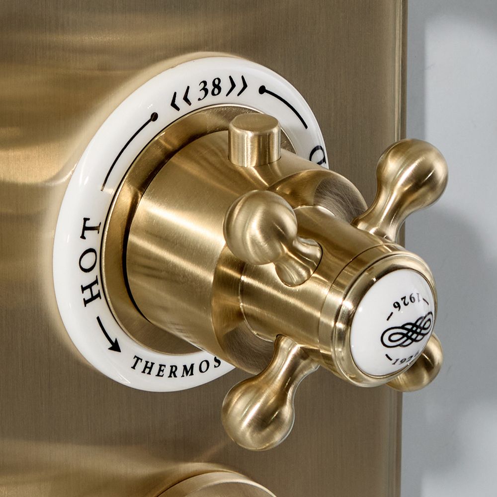 Sa fabrication en laiton massif, sa finition or satiné résistante et ses détails en céramique blanche créent un look à la fois vintage et élégant qui durera dans le temps. Ce mitigeur dispose d’une technologie anti-brûlures et se coupera automatiquement si la température de l’eau dépasse la température de sécurité préréglée, vous assurant ainsi confort, sécurité et aucun risque de brûlures.