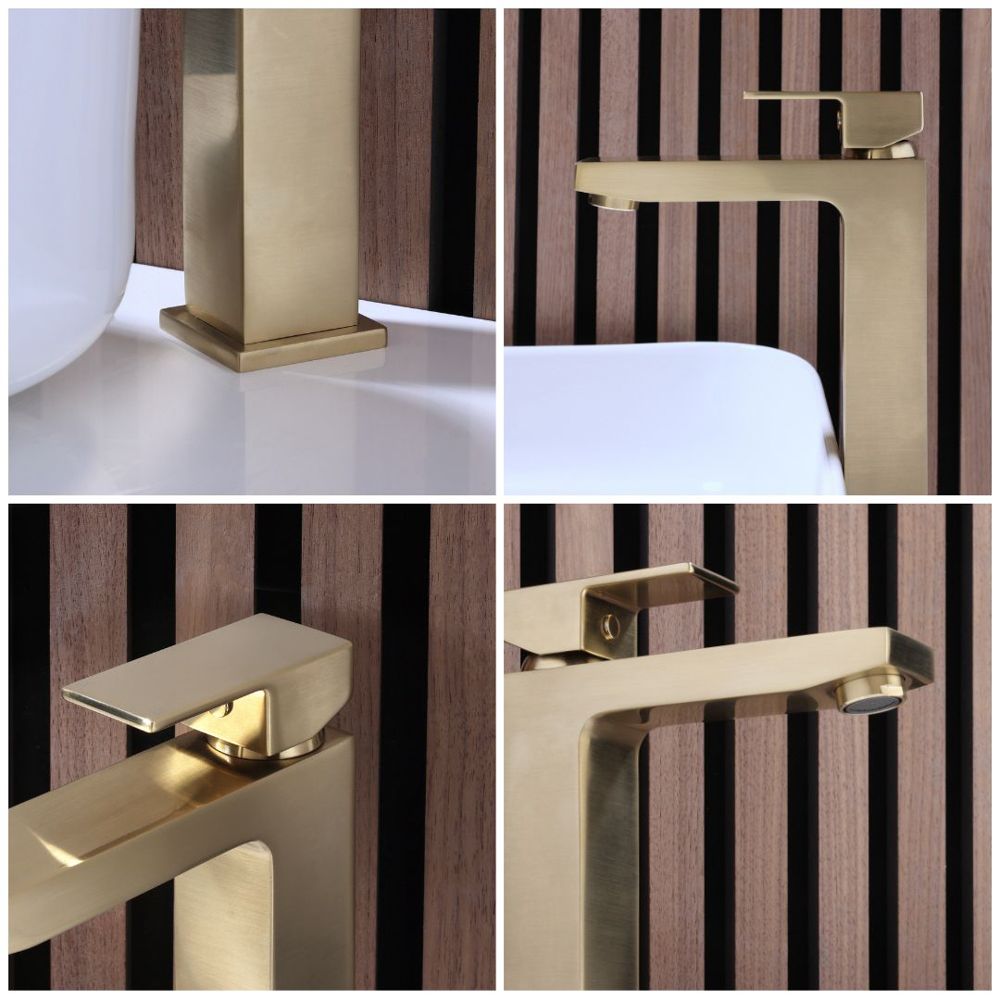 Ce mitigeur de lavabo présente une finition en or satiné et des lignes géométriques élégantes pour une touche design. Fabriqué en laiton, ce mitigeur de lavabo est doté d'un levier unique qui permet de contrôler facilement le débit et la température de l'eau.