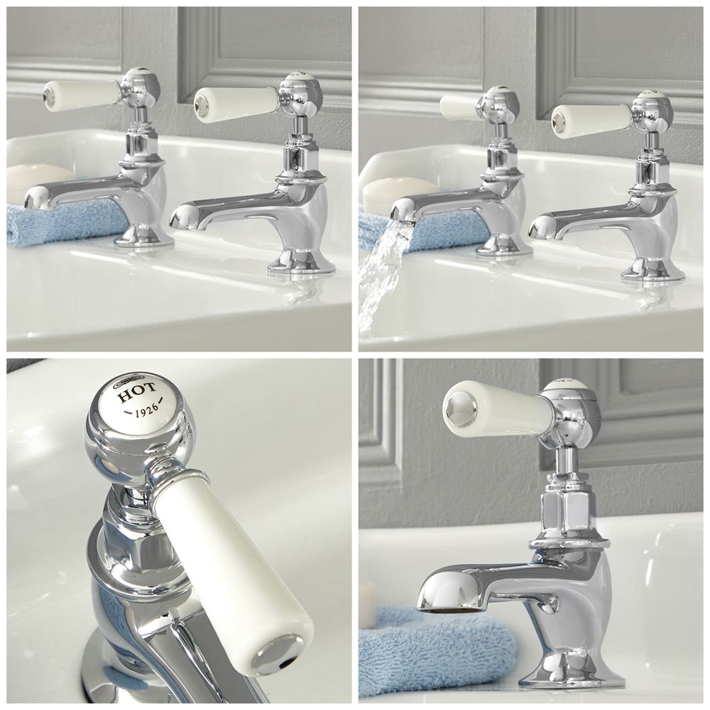 Fabriqués en laiton massif, ces robinets rétro présentent un design intemporel et une finition chromée et blanche. Les commandes à levier en céramique blanche offrent un contrôle facile du débit de l’eau.