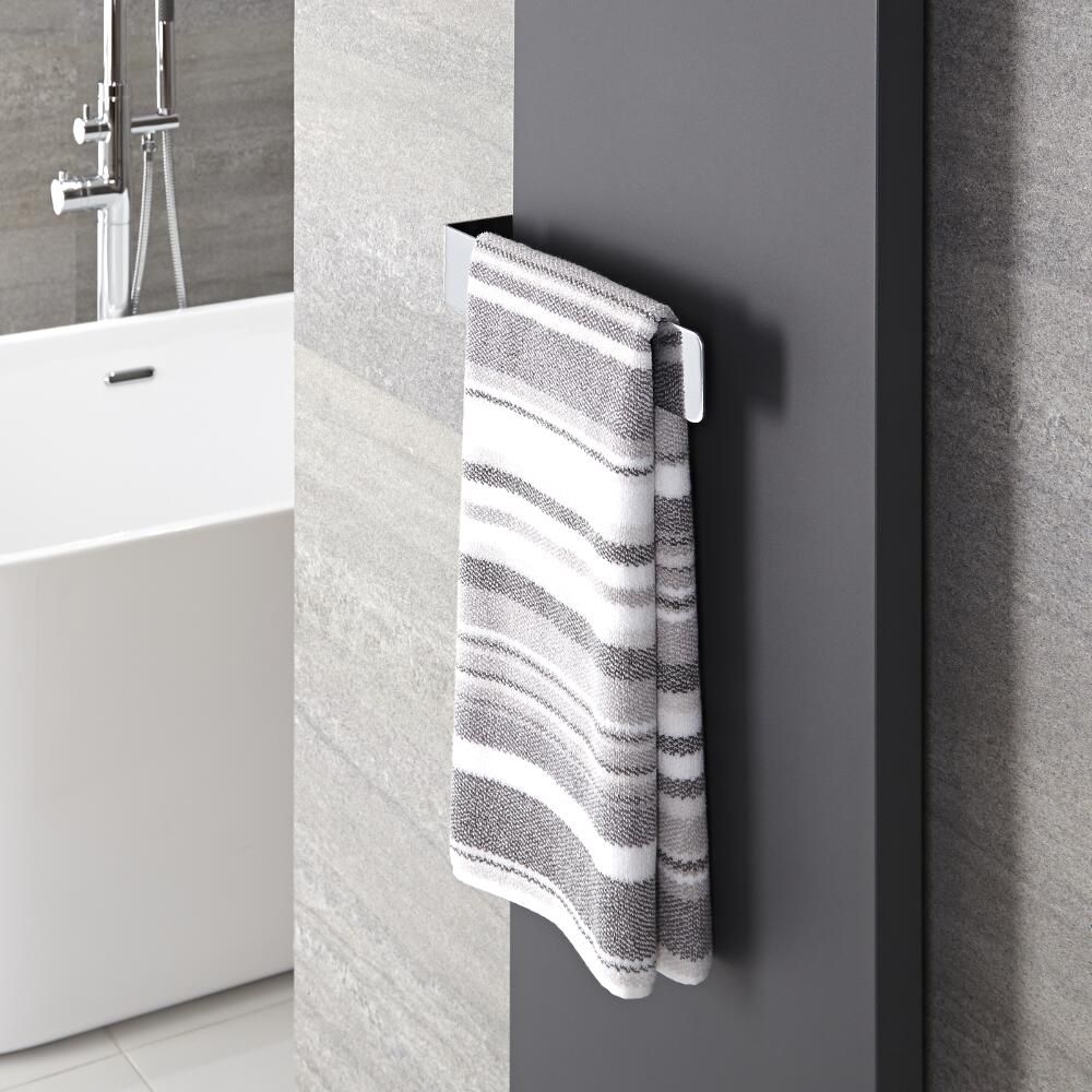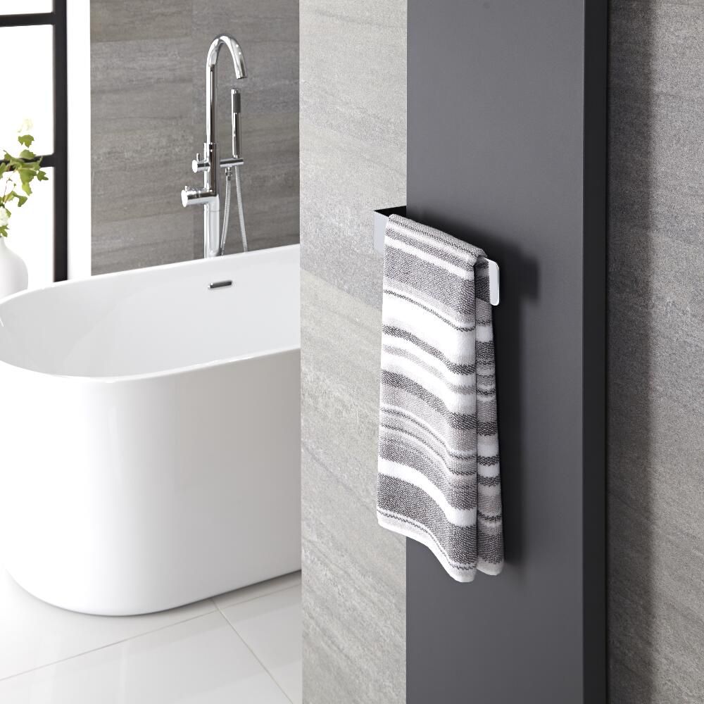 Le radiateur design vertical Rubi à panneau plat, avec porte-serviette chromé, est parfait pour une installation dans votre salle de bain.